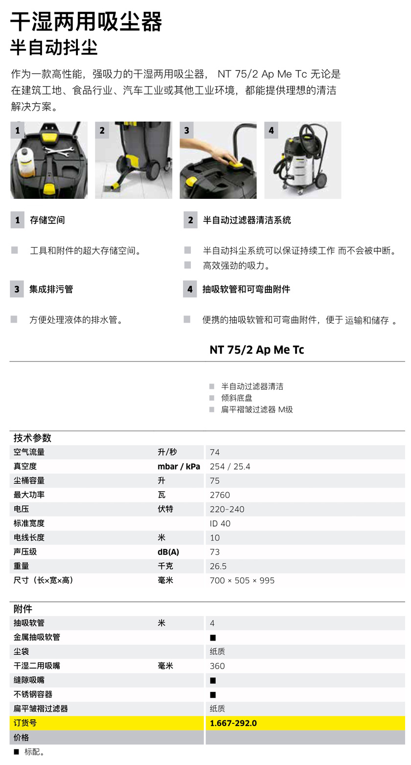 NT 75/2 Ap Me Tc 還設有監(jiān)測系統(tǒng)以確保濕塵的量不要超過限量。通過耐油排水管,液體可以容易地被掏空。配件可以快速連接到吸塵器并方便使用。設備自帶的超大儲物箱可用于存放工具和附件。兩個輪子和兩個滾輪給NT 75/2 Ap Me Tc良好的移動性。