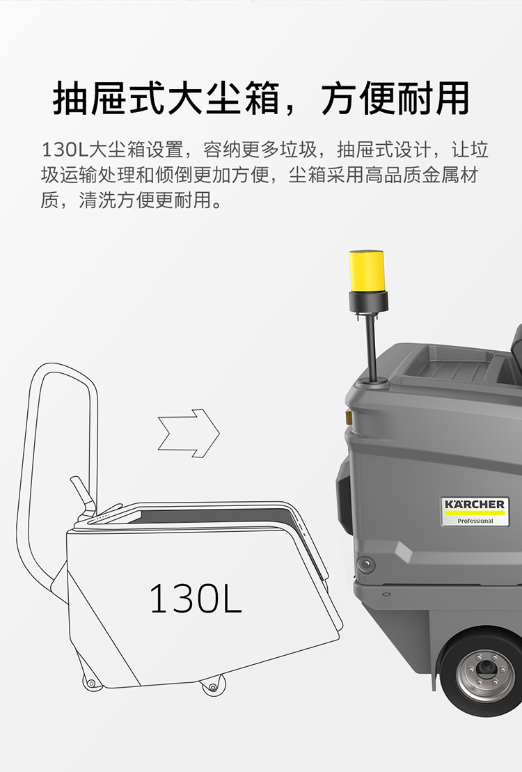 130L大塵箱配置,容納更多垃圾,抽屜式設計,讓垃圾運輸處理和傾倒更加方 便,塵箱采用高品質金屬材質,清洗更方便,耐用。