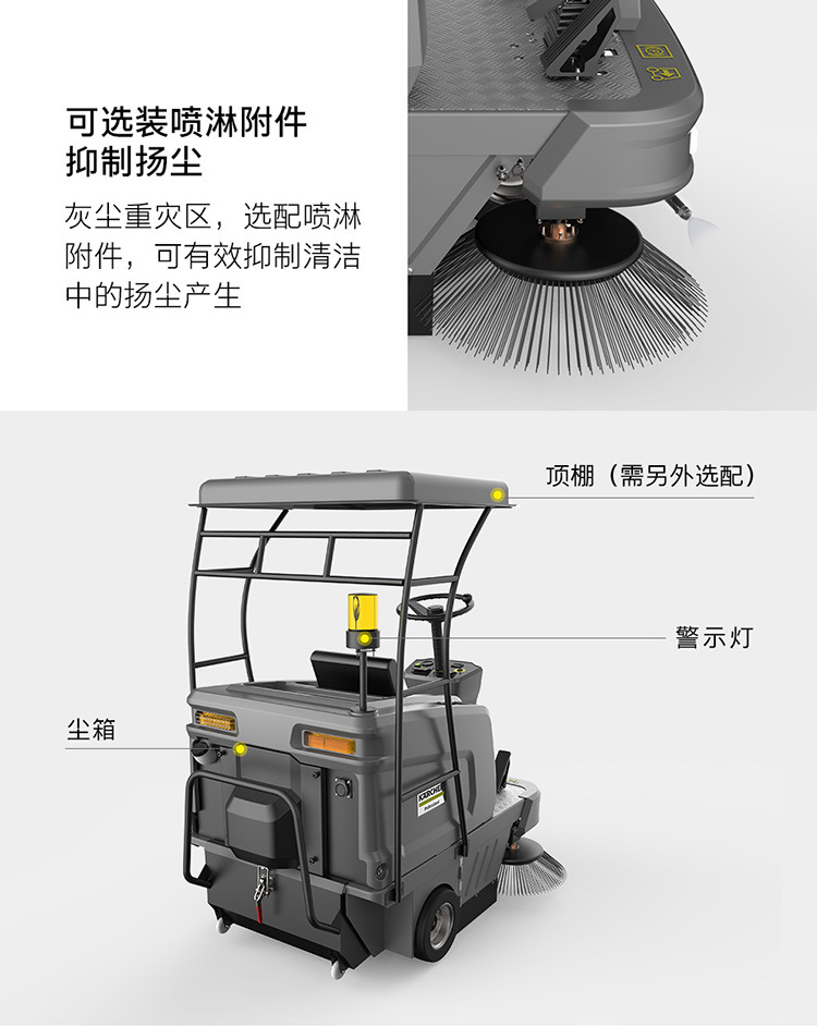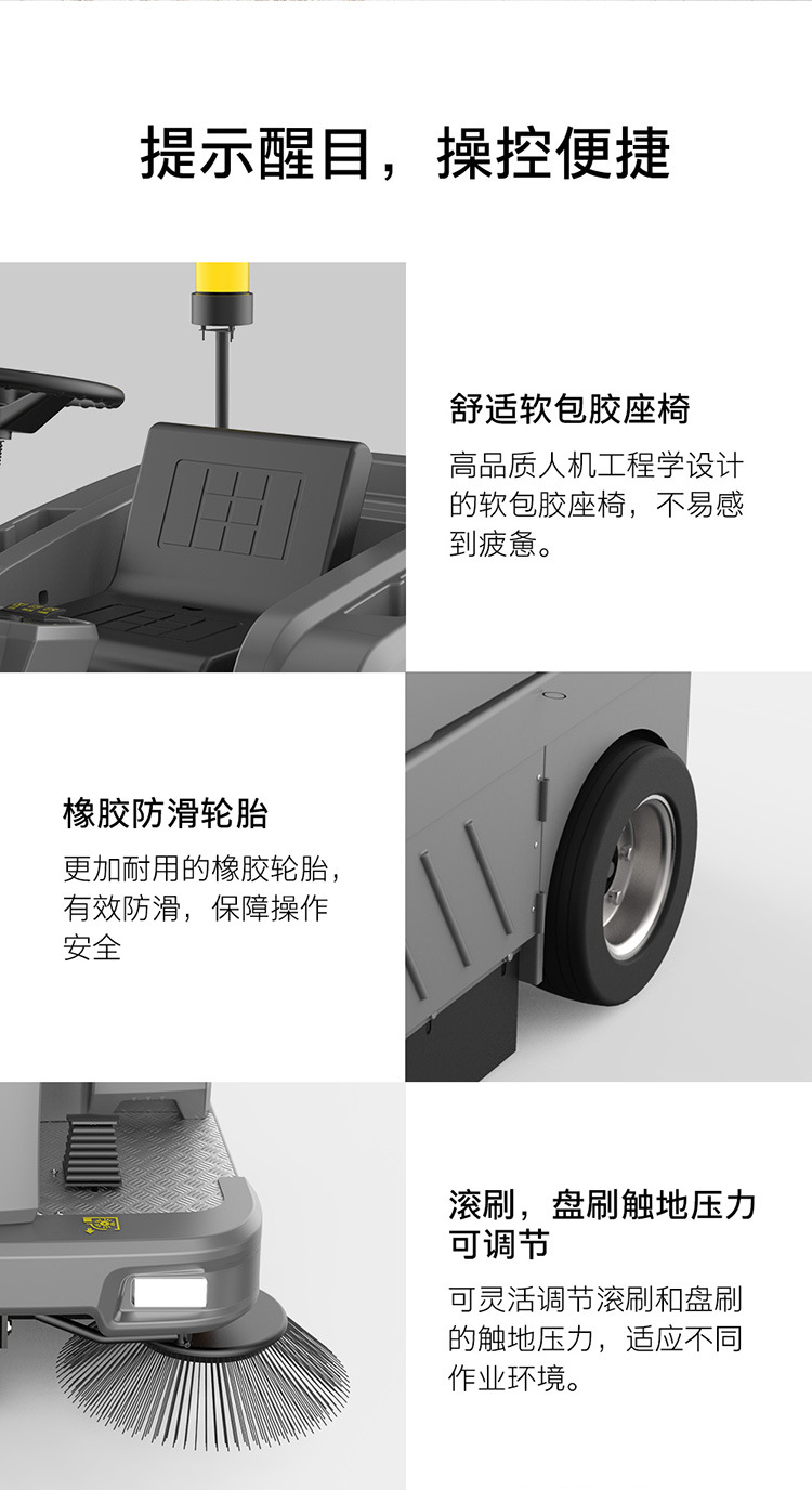 敞開式設計,可加裝頂棚,駕駛式視野極佳,可以有效判斷路口,觀察處理各種 地面垃圾。按鍵式操控按鈕,讓功能選擇和切換都非常簡單,讓清潔更加輕松, 舒適。