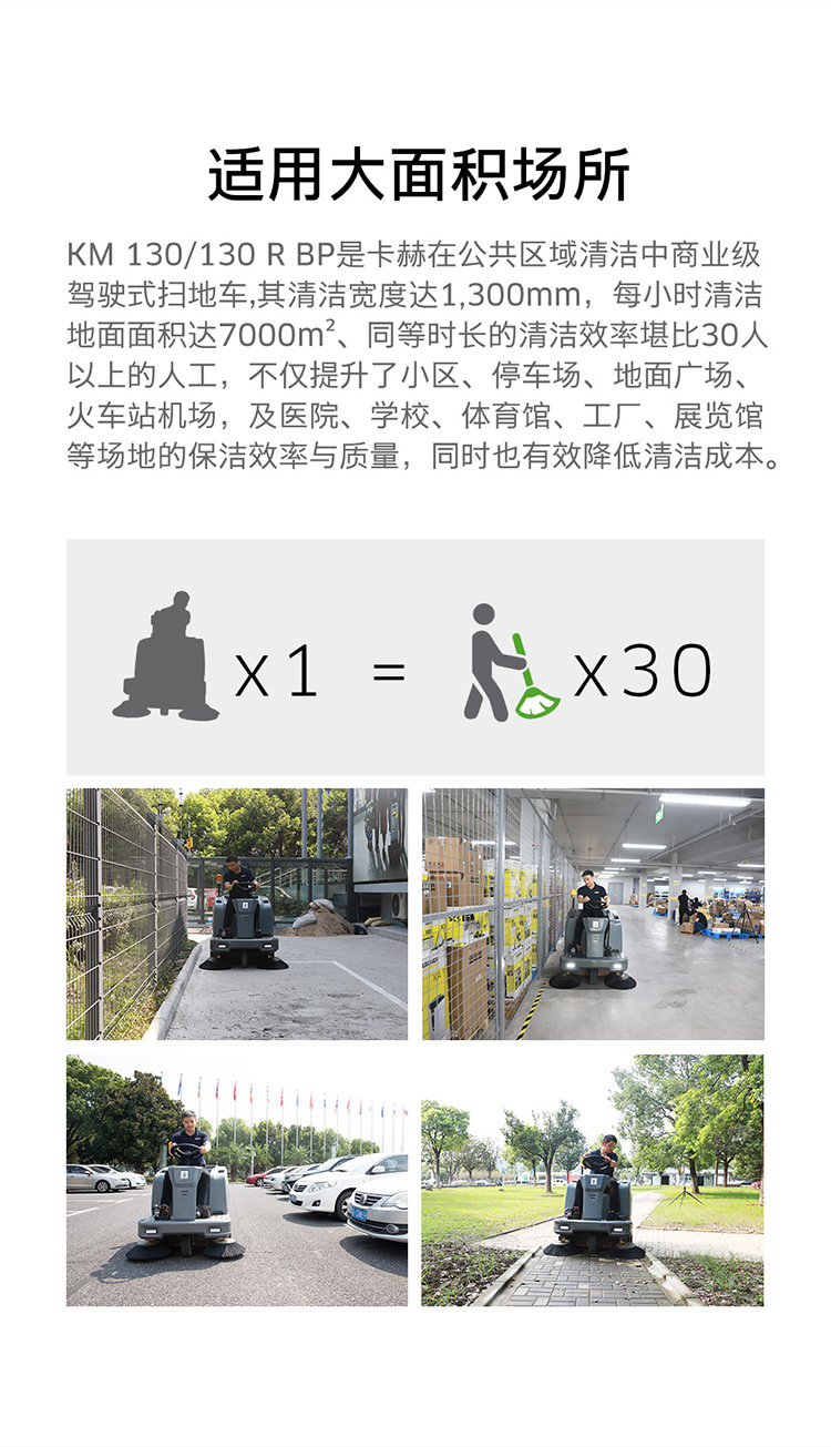 卡赫高品質商業級駕駛式掃地車,清潔寬度1,300mm,每小時可高效清潔7,000㎡以上的地面,告別傳統,有效替代30人以上的人工,可有效清潔瀝青,水泥,砂石,毛石等洗地機無法清洗的地面。